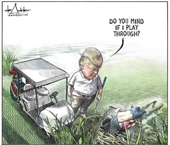 When looking back on his career, de Adder says the cartoon that stands out the most is a 2019 illustration of then U.S. President Donald Trump. The cartoon depicts Trump standing over the bodies of two drowned migrants asking, “Do you mind if I play through,” referencing a real-life image of a father and daughter from El Salvador who drowned trying to cross the Rio Grande.
