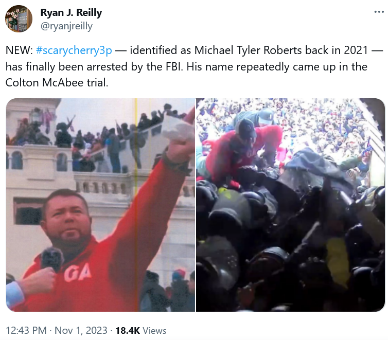 1) Michael Tyler Roberts AKA Michael Roberts, Tennessee, ScaryCherry3P and McAbee's insurrection buddy. He was in the tunnel," observed from his position on top of other rioters grappling with police officers and grabbing hold of their hands and arms." Charged with a felony offense of Obstruction of Law Enforcement During Civil Disorder, civil disorder; and misdemeanor offenses of entering and remaining in a restricted building or grounds, disorderly and disruptive conduct in a restricted building or grounds and disorderly conduct in a Capitol building. https://www.justice.gov/usao-dc/pr/tennessee-man-arrested-felony-and-misdemeanor-charges-actions-during-jan-6-capitol