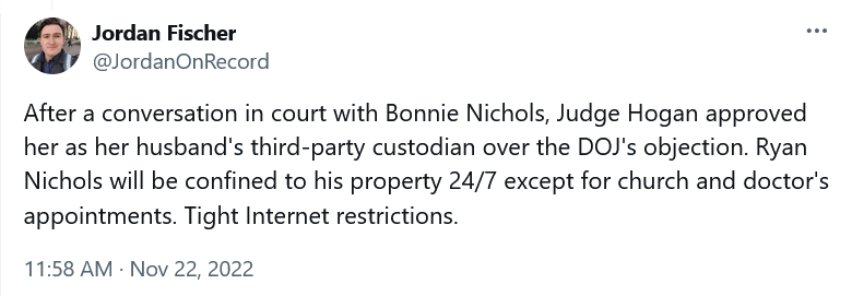 7) Over the DOJ's objection. Ryan Nichols will be confined to his property 24/7 except for church and doctor's appointments.