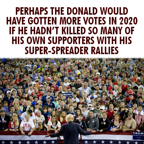His leadership was not to "look weak" by wearing a mask or allowing anyone around him to wear a mask—or even admit to having the disease when he was near death. They loved crowding unmasked into packed indoor arenas to see him. They didn't even learn a lesson from Herman Cain.