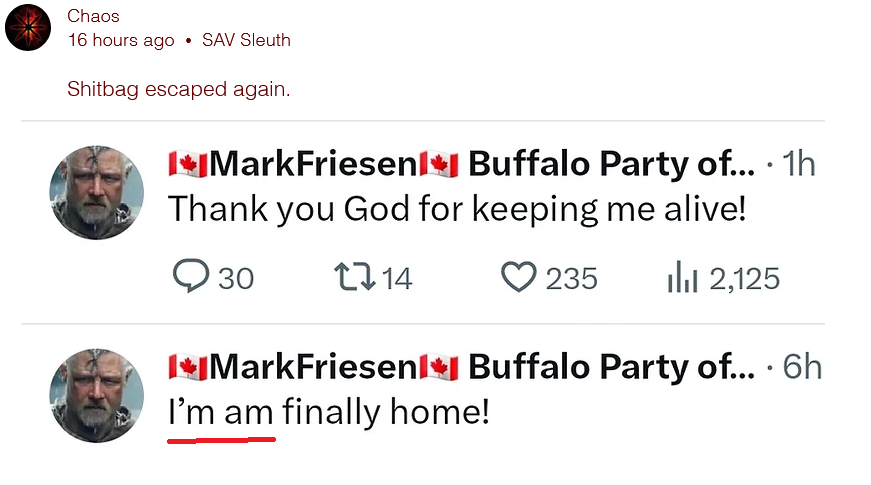 Another Mark Fecesbook exists where I see a few old SAVvers. Here's his Buffalo Party one. For some reason, Mark is not as political on this one...HILARIOUS, as this one is his new party! Best not to show the prairie folks who he REALLY is... https://www.facebook.com/people/Mark-Friesen-Buffalo-Party/100086410924934/