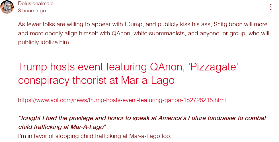 (I provided this info to the Jan 6 committee, along with 10 other pages of info. Being these 2 POS are not named in any suits and will not face consequences for the damage they have done worldwide, I can take a little pride in knowing they are now named as Q conpirators in the Congressional records. Who knows what underground damage they are continuing to do out of the spotlight, sigh)