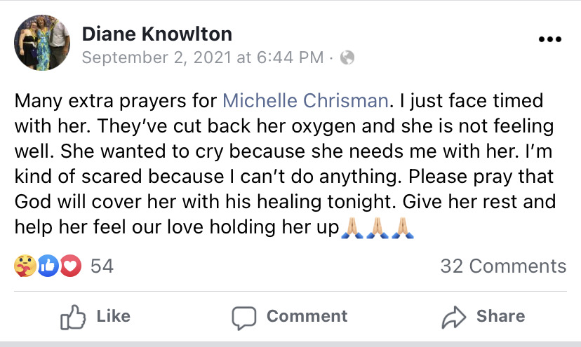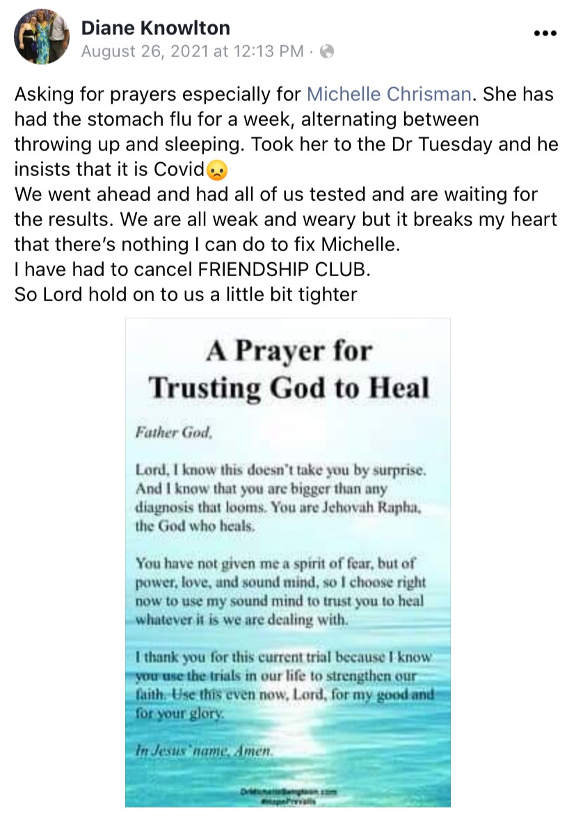 Diane is a coordinator for a teen club for kids and adults with disabilities. She was widowed, but remarried in 2018, to Chris Knowlton. She has four adult kids. Her daughter Michelle has Down Syndrome. Michelle is the innocent one in this story, so please, no negative comments about her.