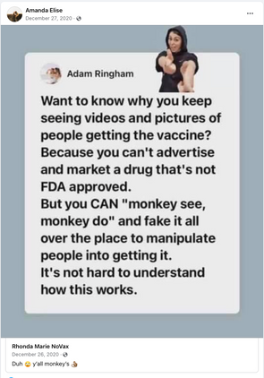 Amanda's friend Kasandra questions why the frontline workers are getting the vaccine first because it might kill them all leaving nobody to take care of the sick and elderly. Then she adds that she's not getting the vaccine, regardless.