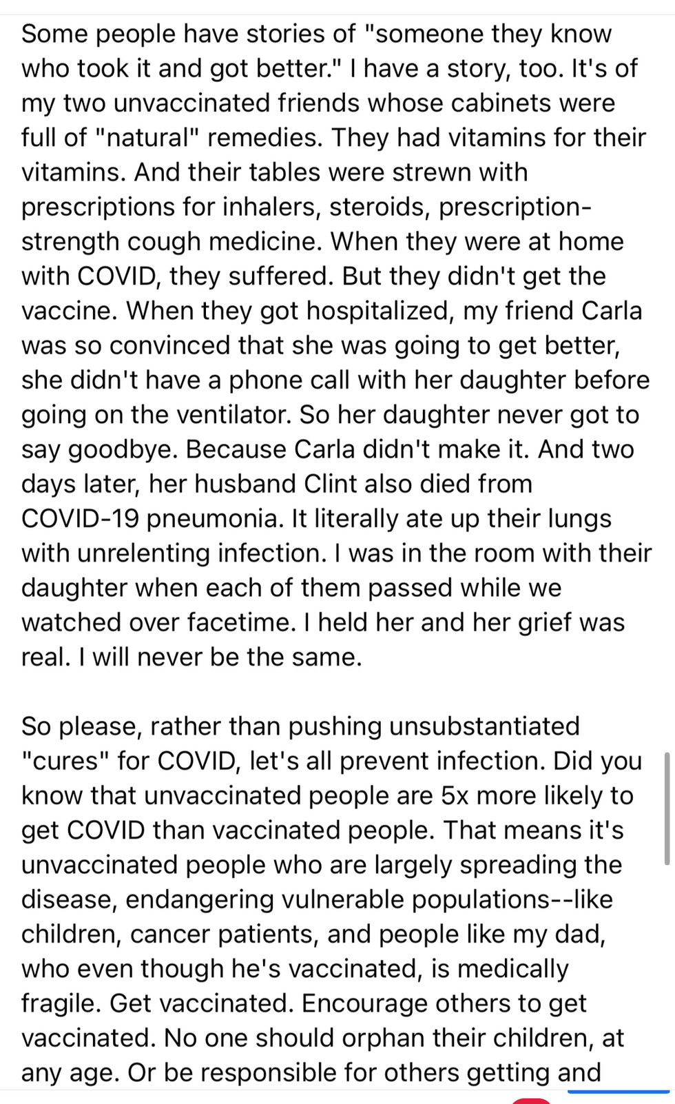 Here comes that one friend touting horse dewormer. Carla's doctor was already on top of it and prescribed it for her.