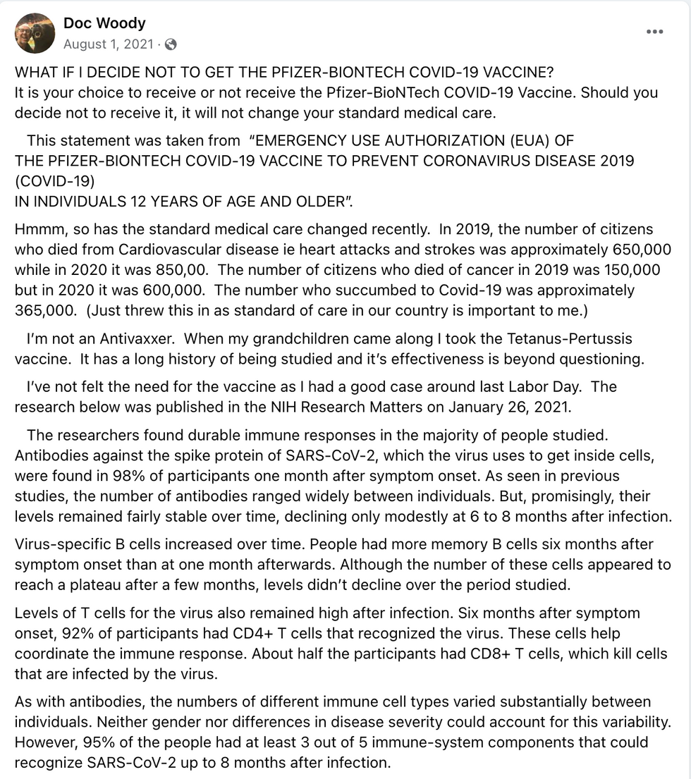 Be prepared to read a lot as Dr. Woody doesn't just copy/paste/share like most. He loves to write out his full opinions and it's a lot to digest. A hell of a lot. I'm used to skimming anti-vaxxer copy pasta posts so I have enough time to get you as many stories as possible. Today, I did a lot of heavy lifting with this one so I can share this crazy story with you, great folks. 😎