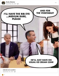 The only picture of Shelly I could find was with a cut out of Donald Trump, so I doubt you'll be surprised to discover that she REALLY hates President Biden and Vice President Harris. She even tries to slut shame VP Harris. Pretty vile stuff.